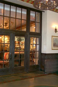 The dining room is another of the public areas that must be seen to fully appreciate its grandeur. The ceiling ridgeline soars 34 feet above the floor, and features massive trusses -- which we're told are sugar-pine from outside the park. But look closely at the tree trunks that stand nobly to support the trusses. These too are molded concrete, stained and painted to replicate real logs. The wrought iron craftsman style chanedliers are simply stunning.